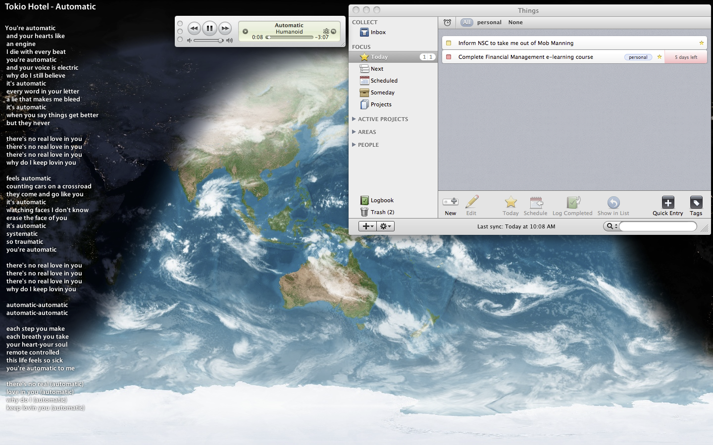 You’ll see DesktopLyrics (with GimmeSomeTune, an automatic lyrics fetcher), iTunes, EarthDesk, and Things as permanent residents in this secondary-screen estate.